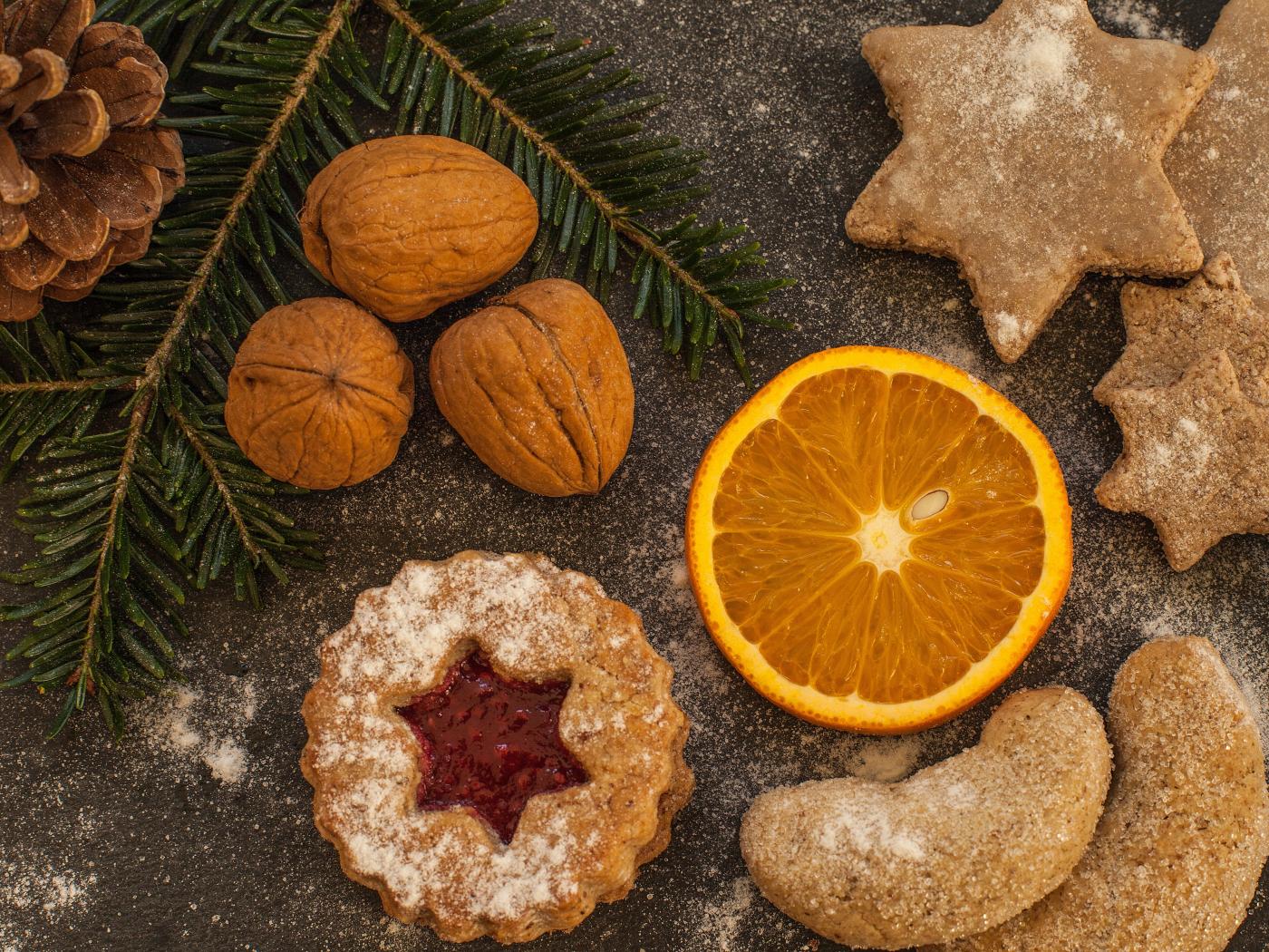 Wallpaper Cookies on a table with walnuts and a slice of orange