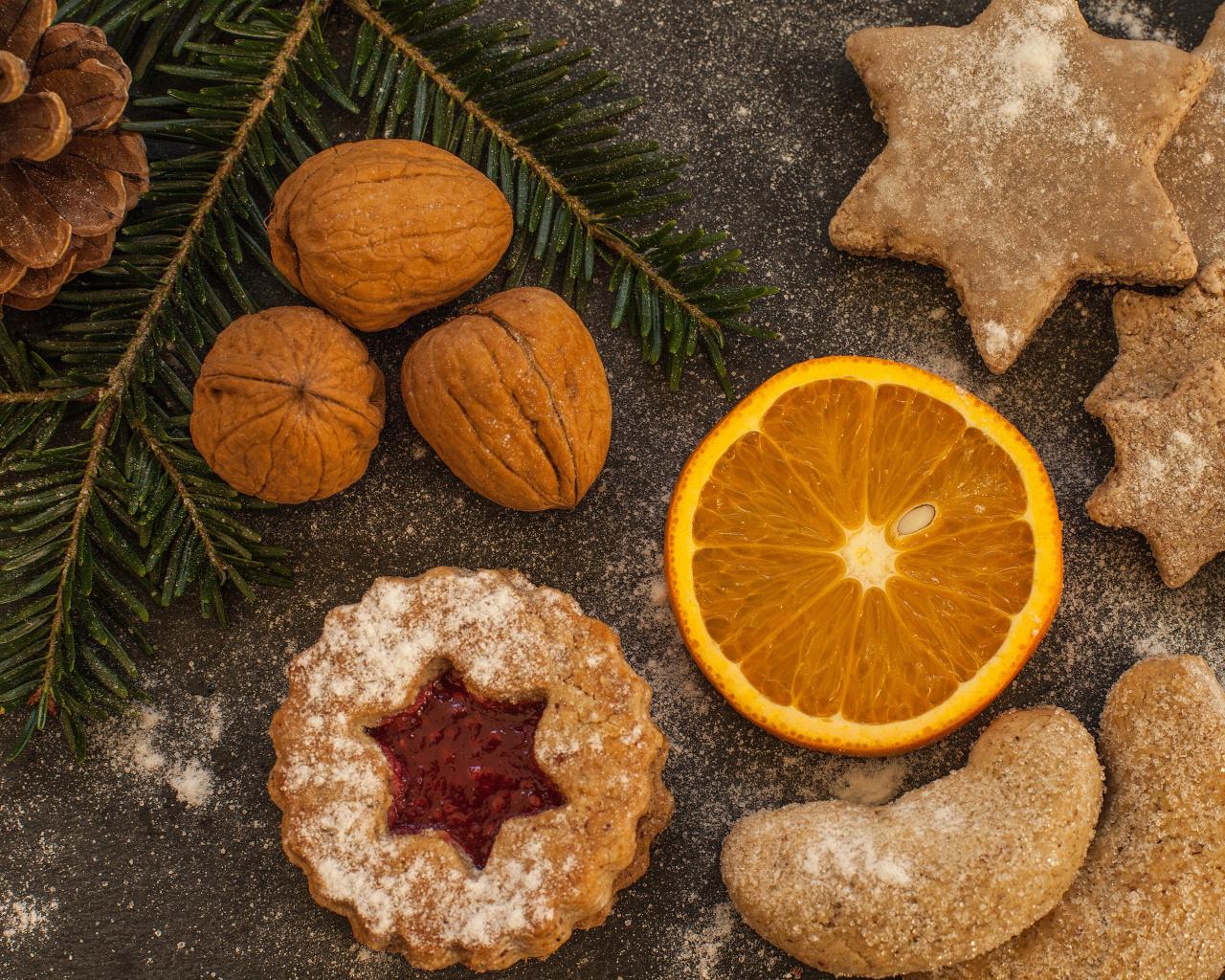 Wallpaper Cookies on a table with walnuts and a slice of orange