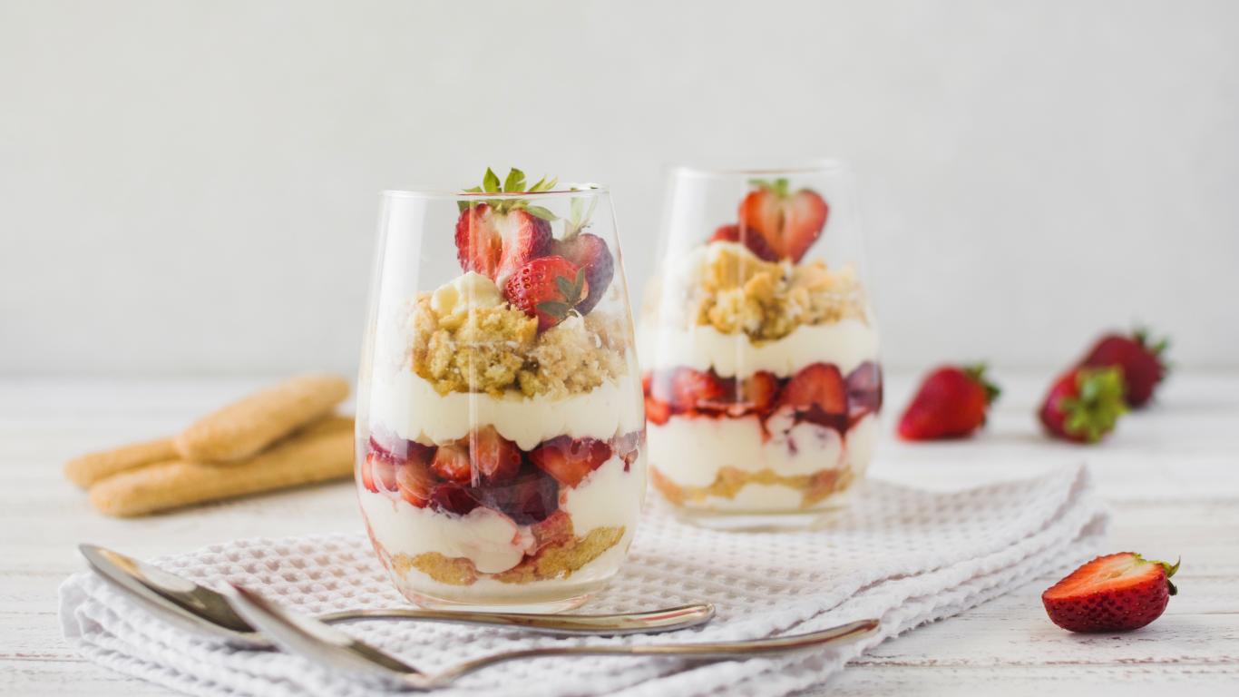 Wallpaper Dessert with strawberries in glass cups on the table