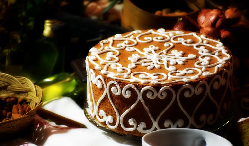 Wallpaper Beautiful cake with a white pattern on the table