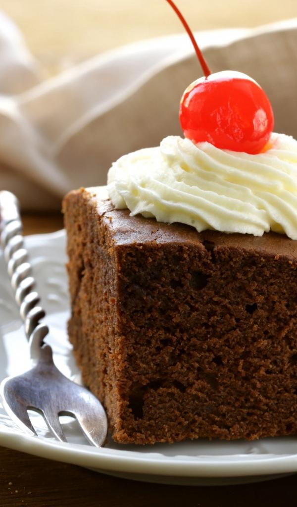 Wallpaper A piece of chocolate cake with cream and cherry