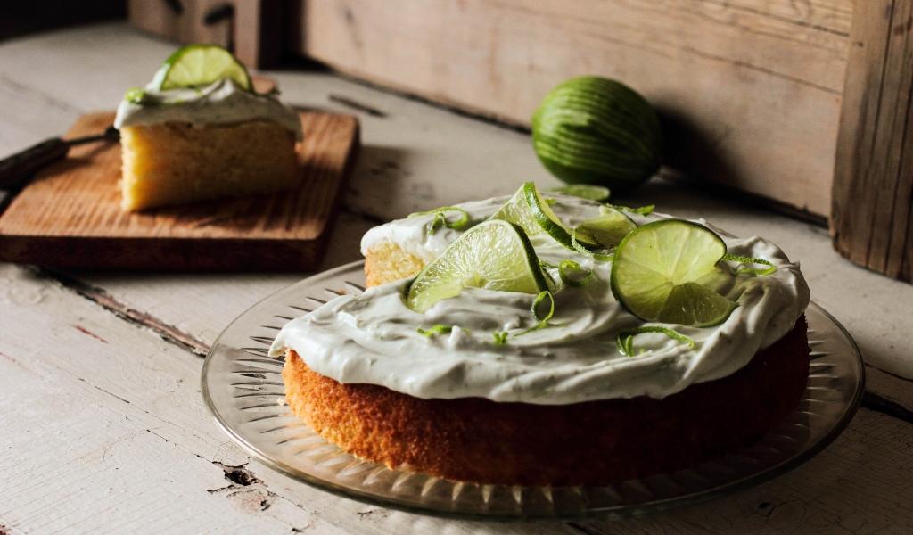 Wallpaper Pie with cream and slices of lime on the table