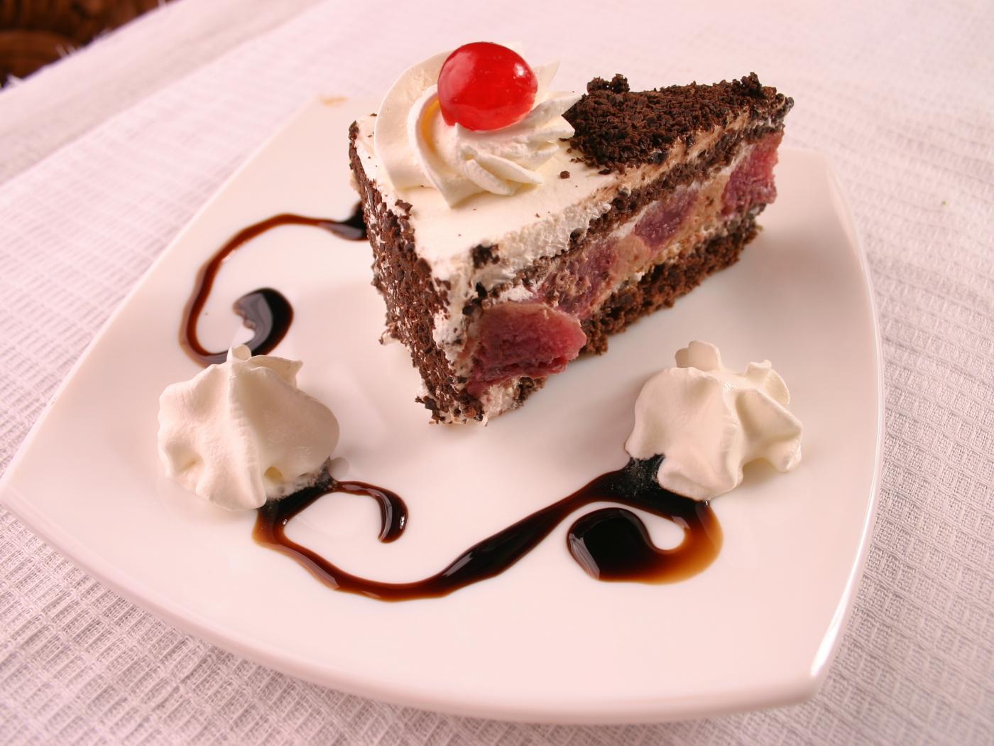 Wallpaper Piece of cake with ice cream on a white plate