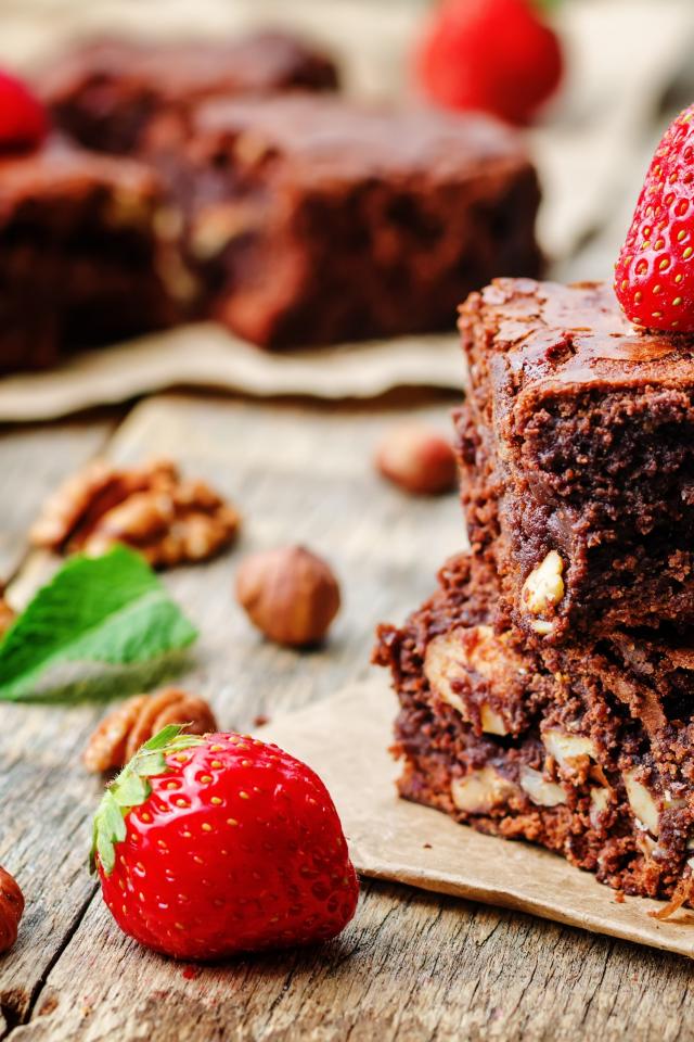 Wallpaper Brownies with nuts and fresh strawberries