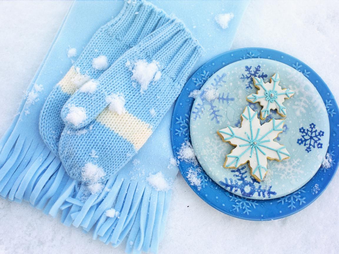Wallpaper Snowflake cookies on snow with a scarf and mittens