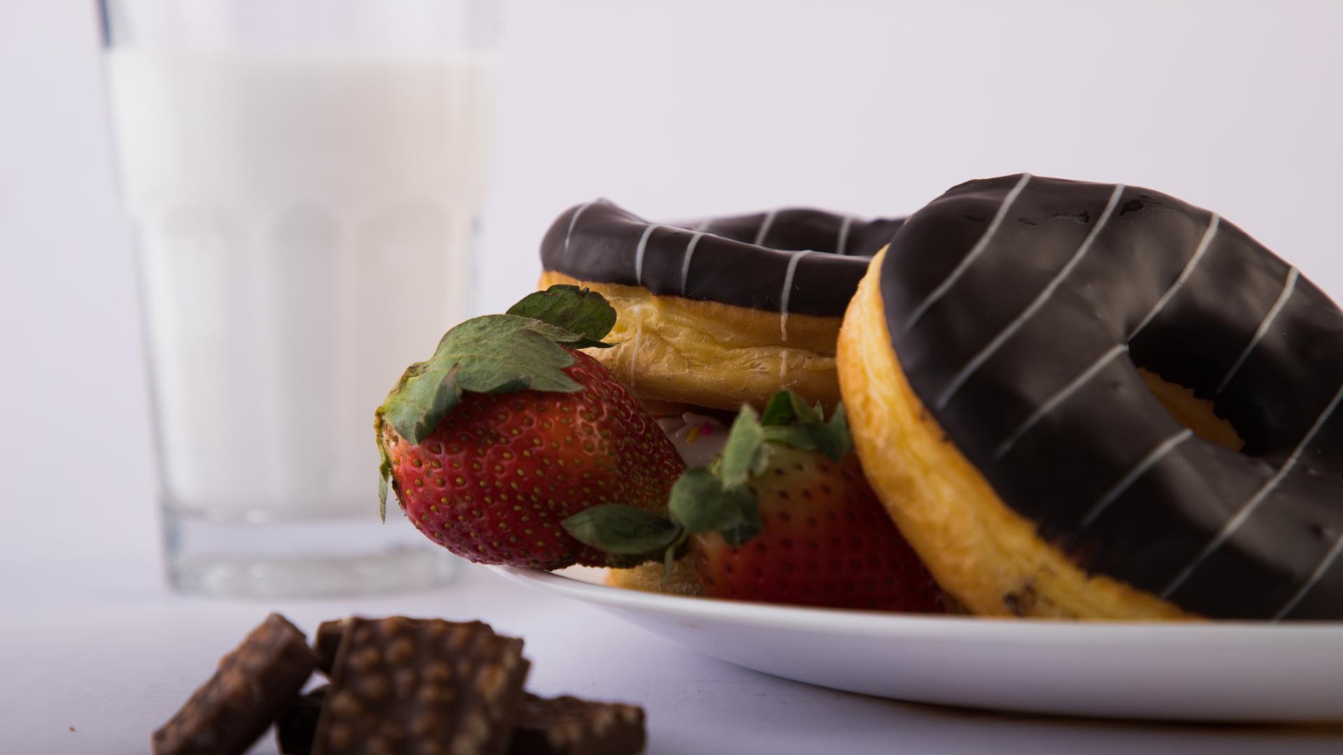 Wallpaper Chocolate covered donuts on a plate with strawberries