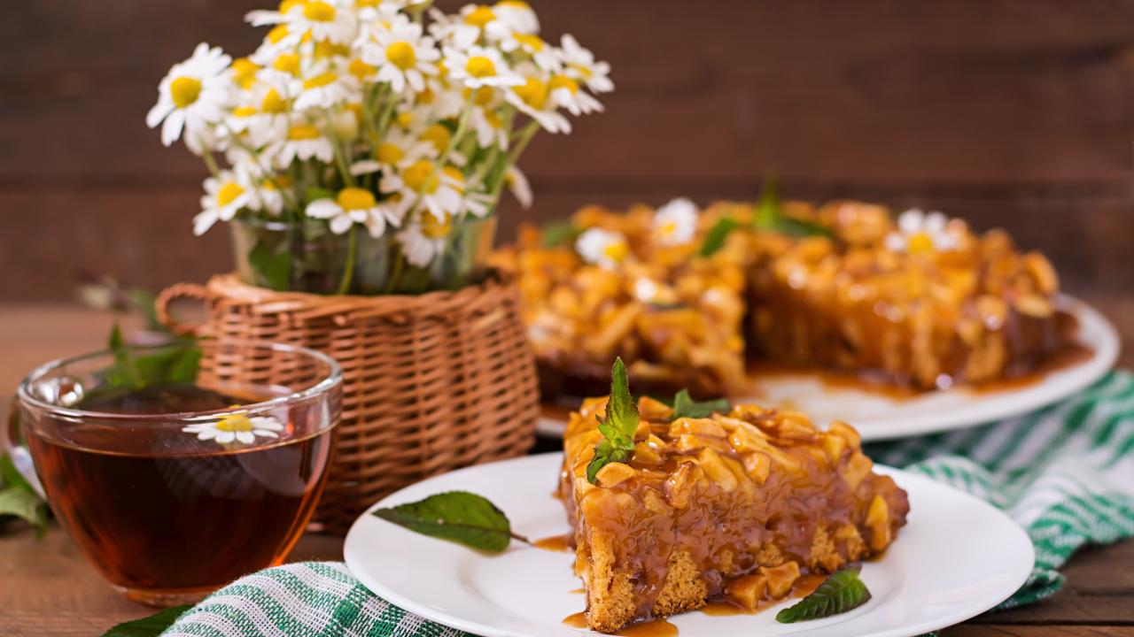 Wallpaper Pie on the table with tea and a bouquet of daisies