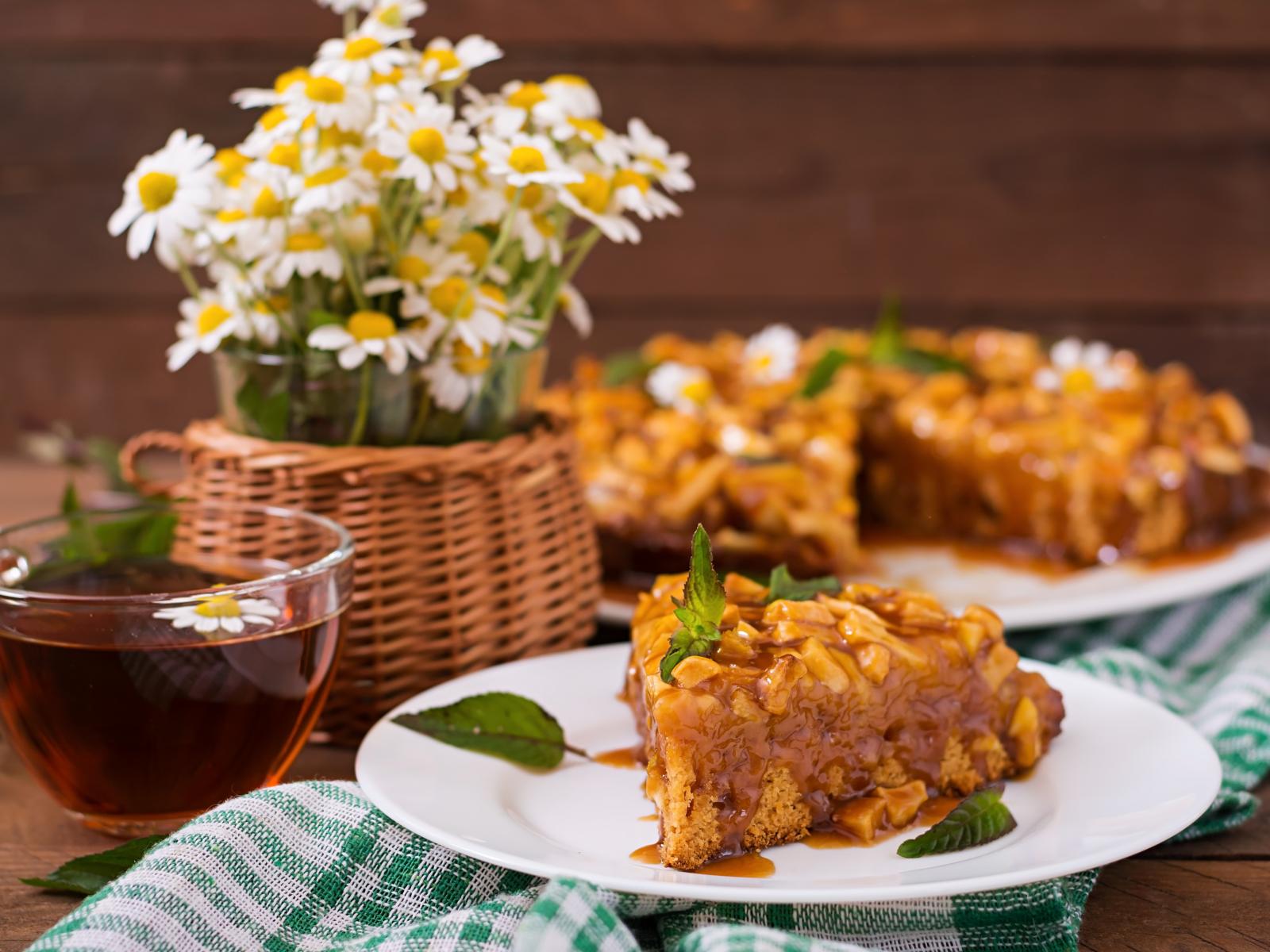 Wallpaper Pie on the table with tea and a bouquet of daisies