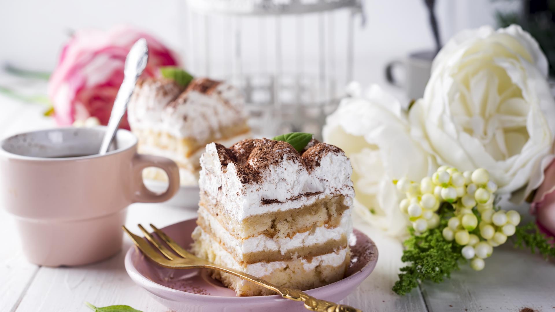 Wallpaper Cake on the table with coffee and flowers