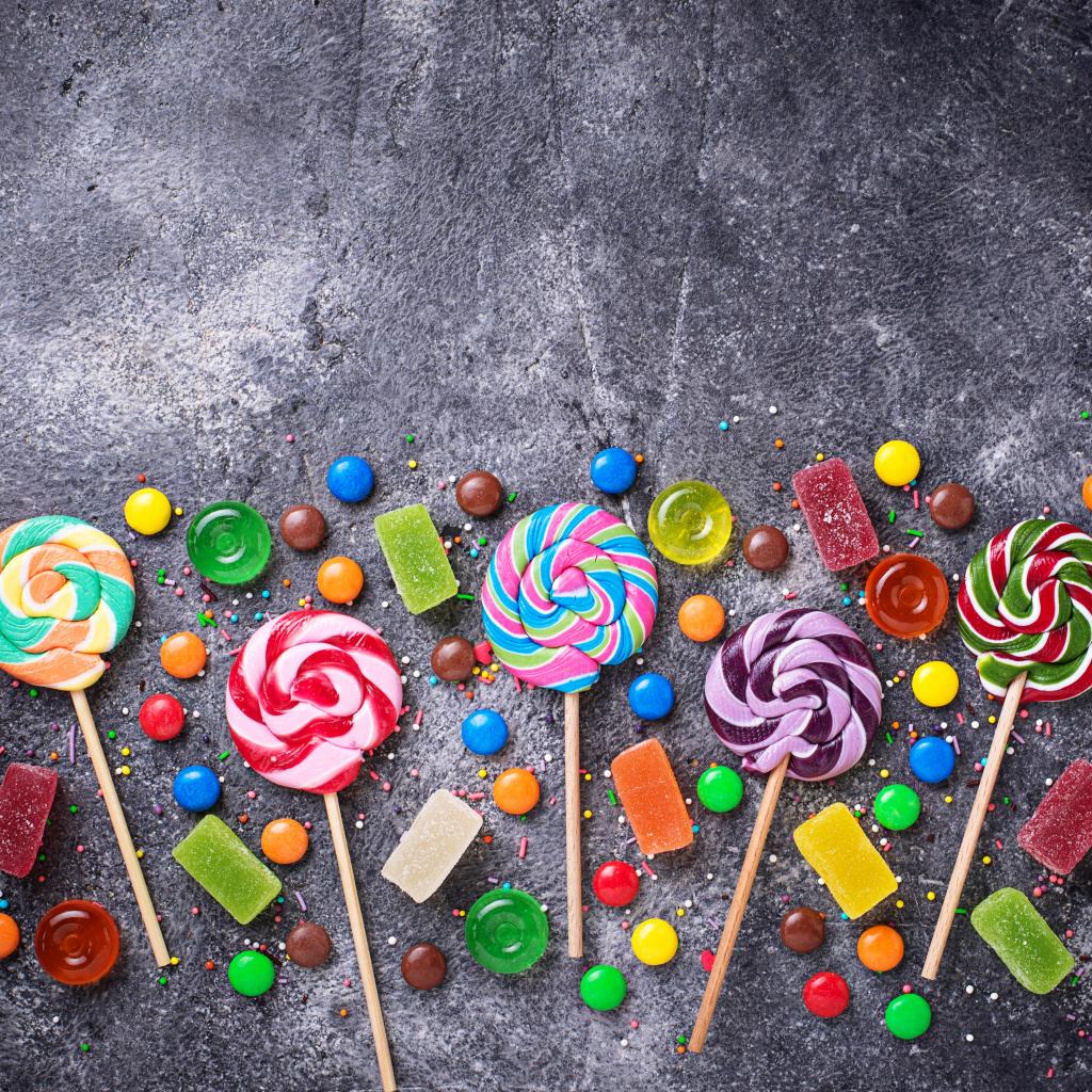 Wallpaper Multi-colored lollipops on a gray table