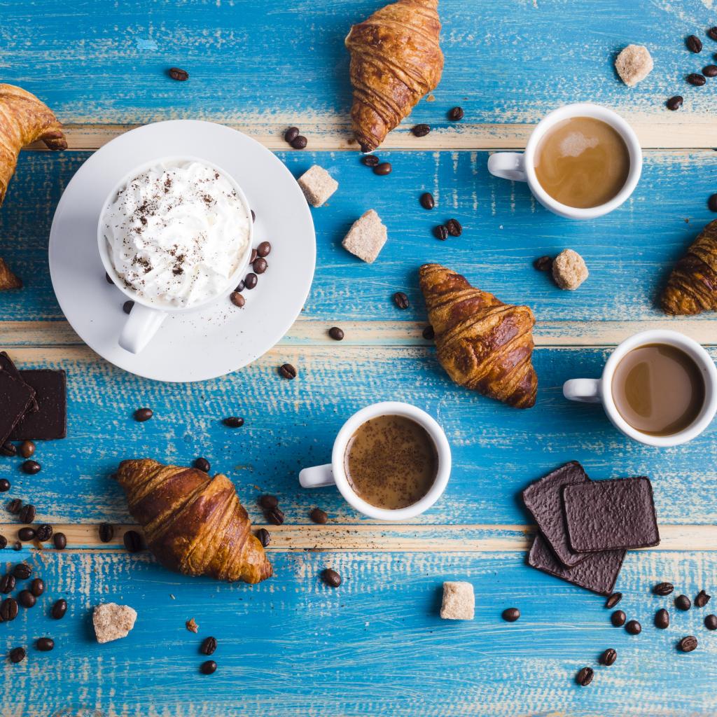 Wallpaper Sweets with coffee on the blue table