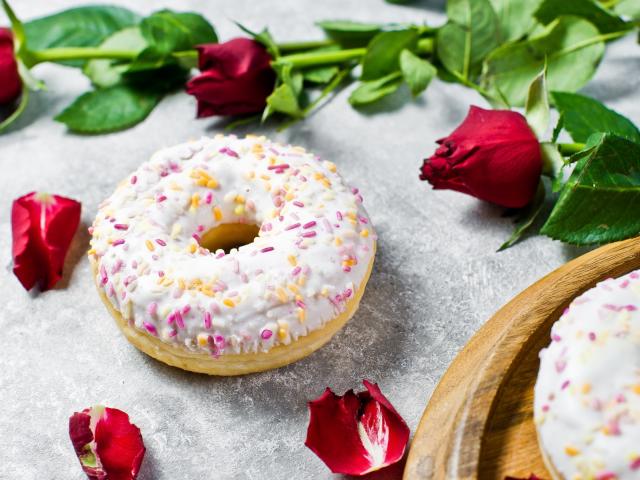 Wallpaper Sweet donut with icing on the table with red roses