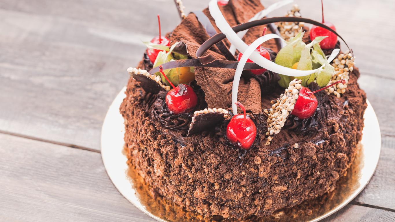 Wallpaper Cake with chocolate and sweet cherry on the table
