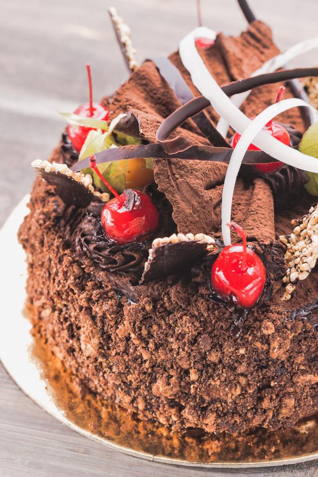 Wallpaper Cake with chocolate and sweet cherry on the table