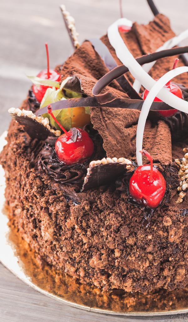 Wallpaper Cake with chocolate and sweet cherry on the table