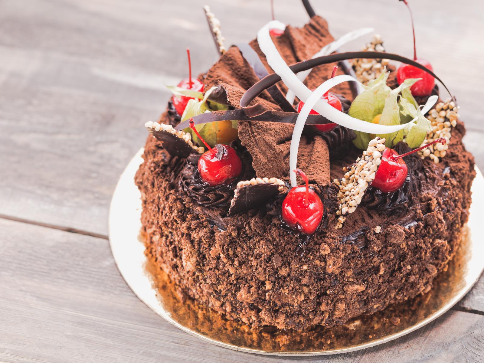 Wallpaper Cake with chocolate and sweet cherry on the table