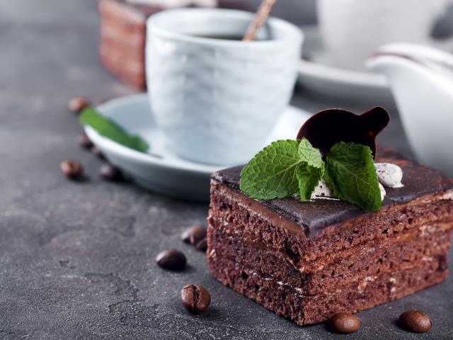 Wallpaper Chocolate cake on the table with a cup of coffee