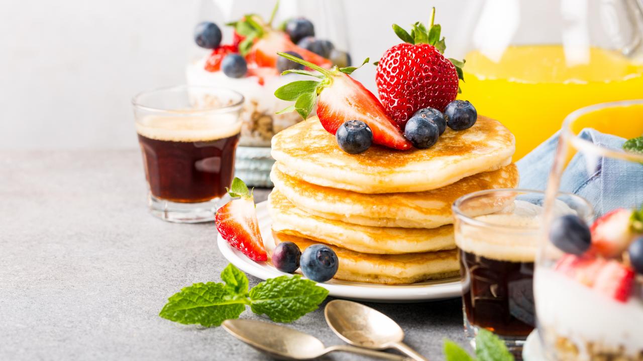 Wallpaper Pancakes with berries on the table with juice