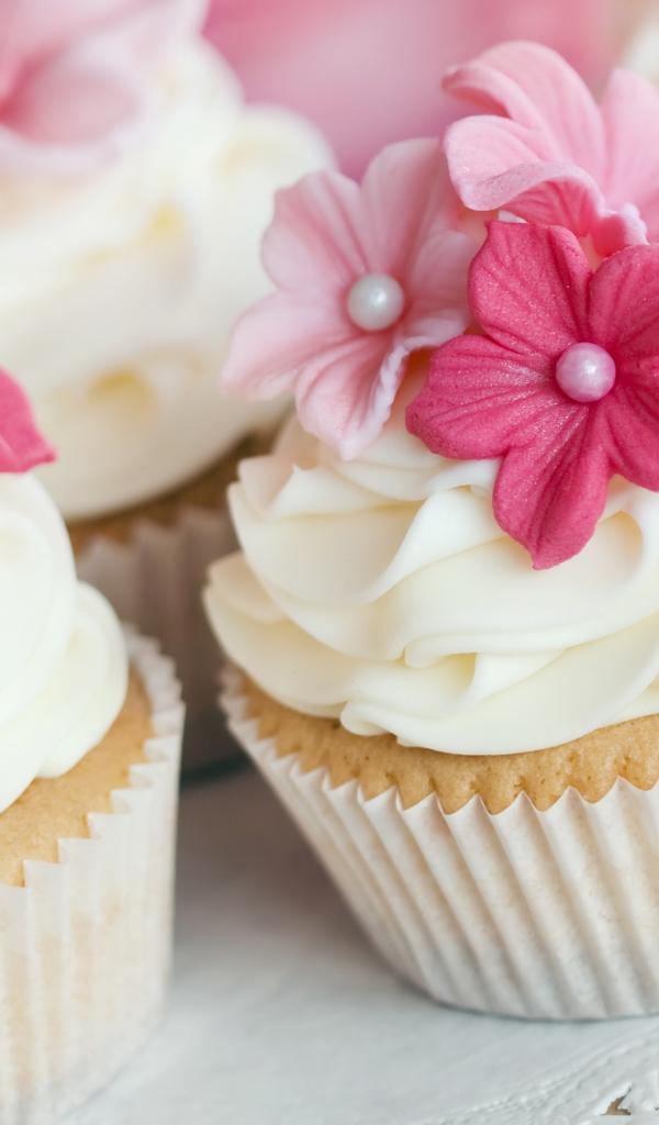 Wallpaper Cupcakes with cream and pink flowers close up