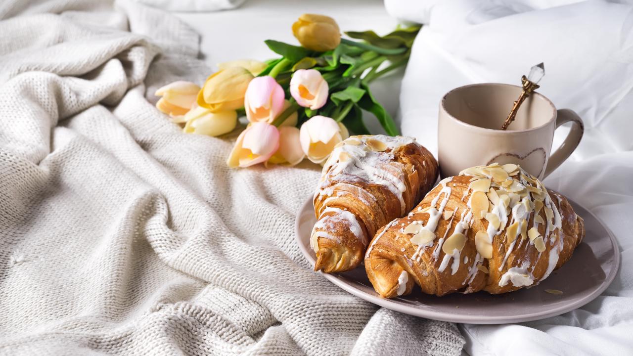 Wallpaper Croissants on a bed with coffee and a bouquet of tulips