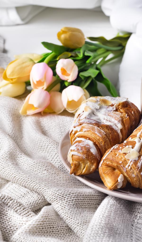 Wallpaper Croissants on a bed with coffee and a bouquet of tulips