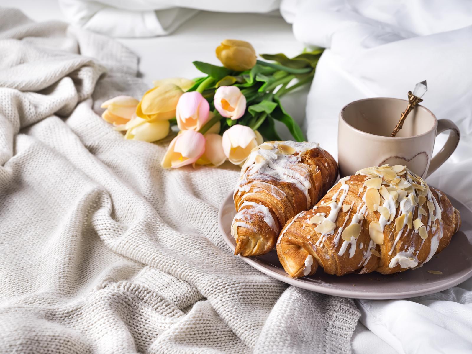 Wallpaper Croissants on a bed with coffee and a bouquet of tulips