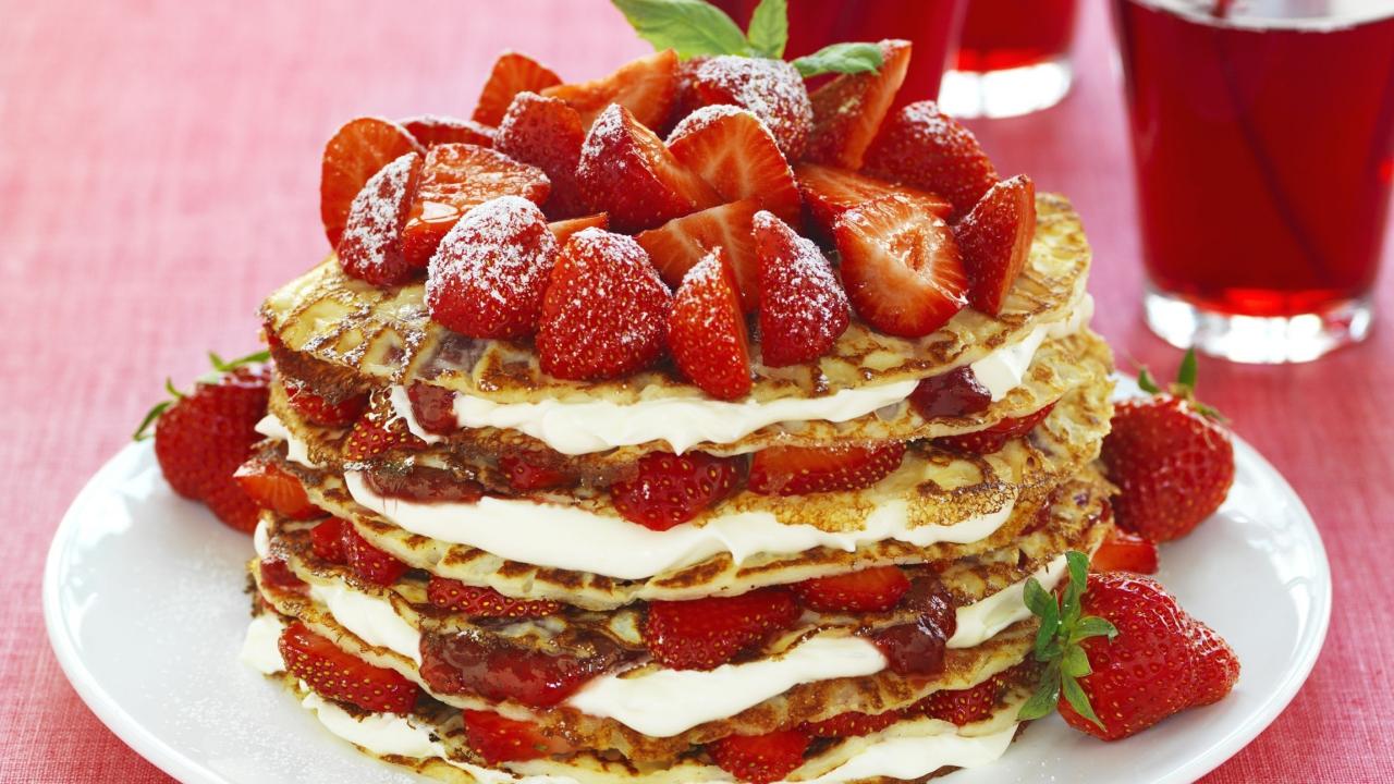 Wallpaper Cake of pancakes with strawberries, jam and sour cream