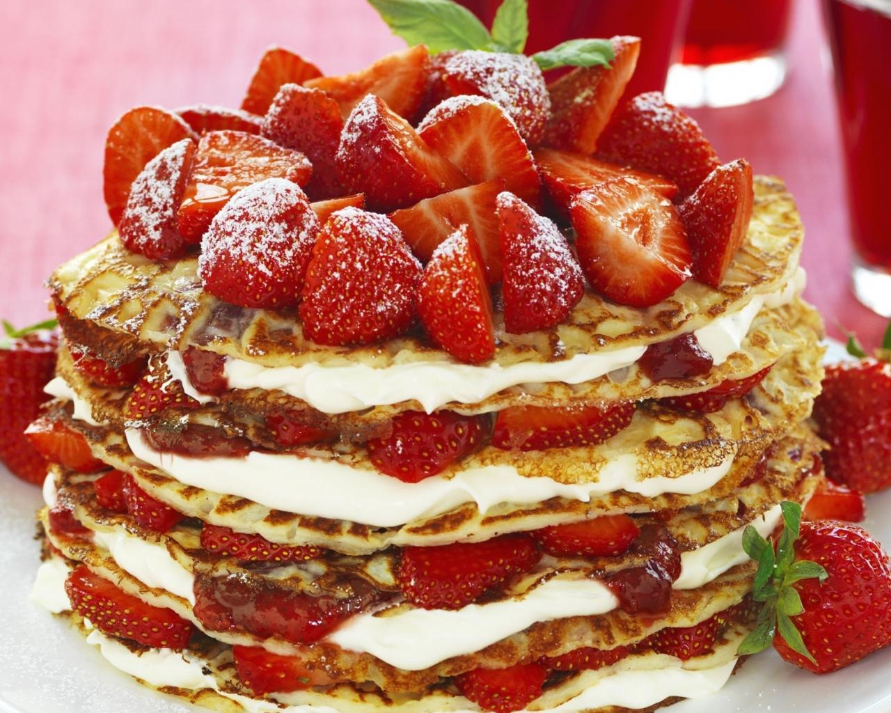 Wallpaper Cake of pancakes with strawberries, jam and sour cream