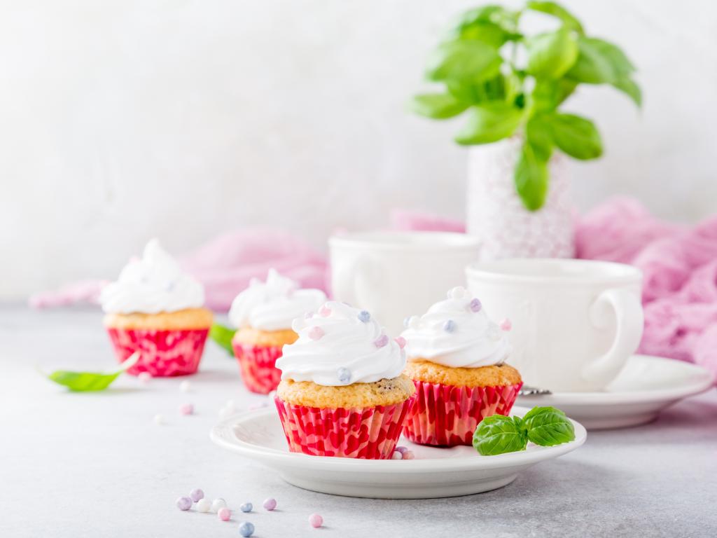 Wallpaper Delicious cupcakes with cream on the table with cups