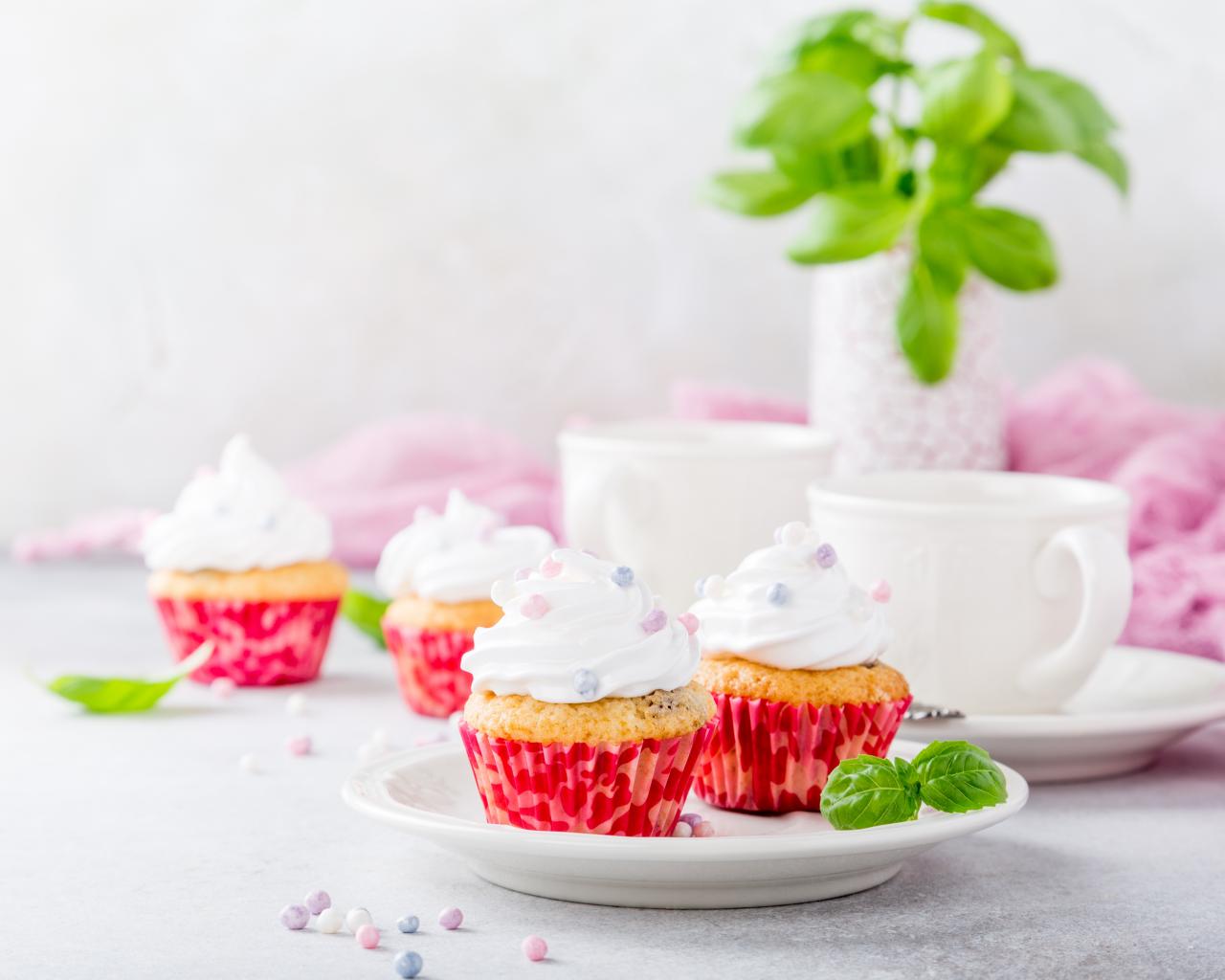 Wallpaper Delicious cupcakes with cream on the table with cups