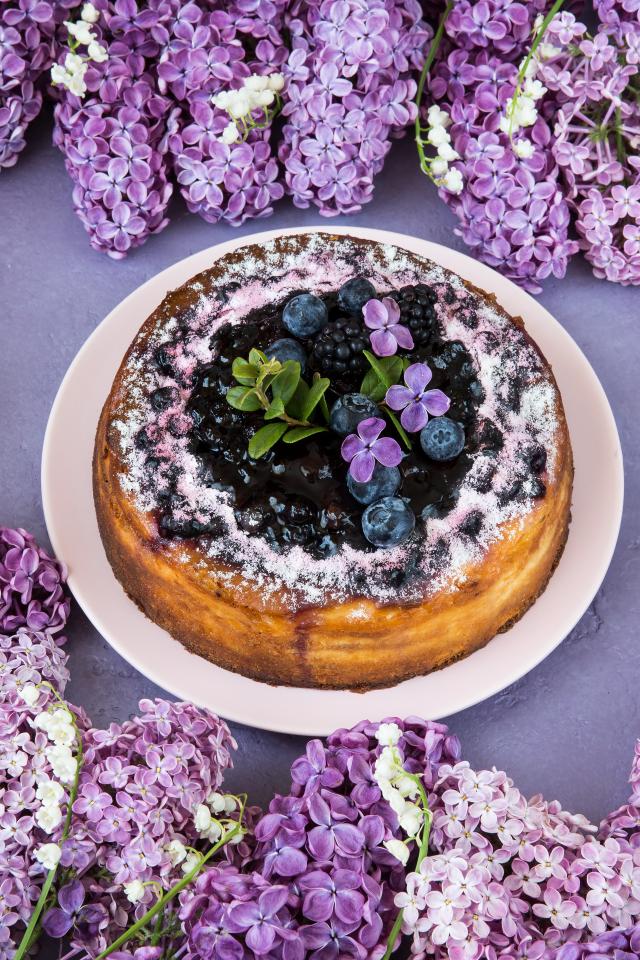 Wallpaper Delicious berry pie with lilac flowers