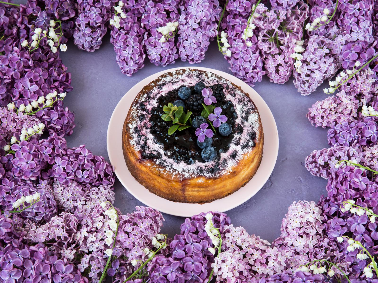 Wallpaper Delicious berry pie with lilac flowers