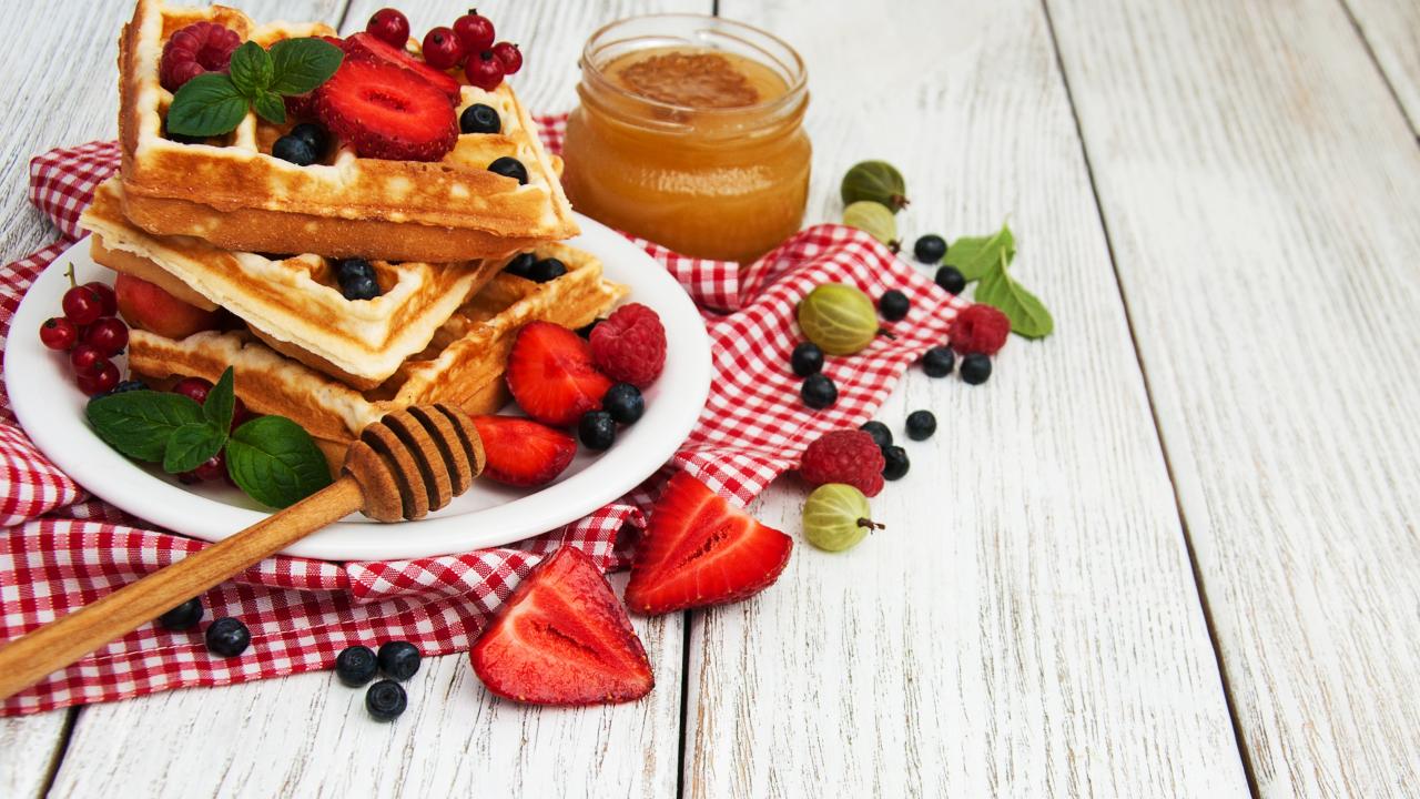 Wallpaper Sweet waffles on a table with berries and honey