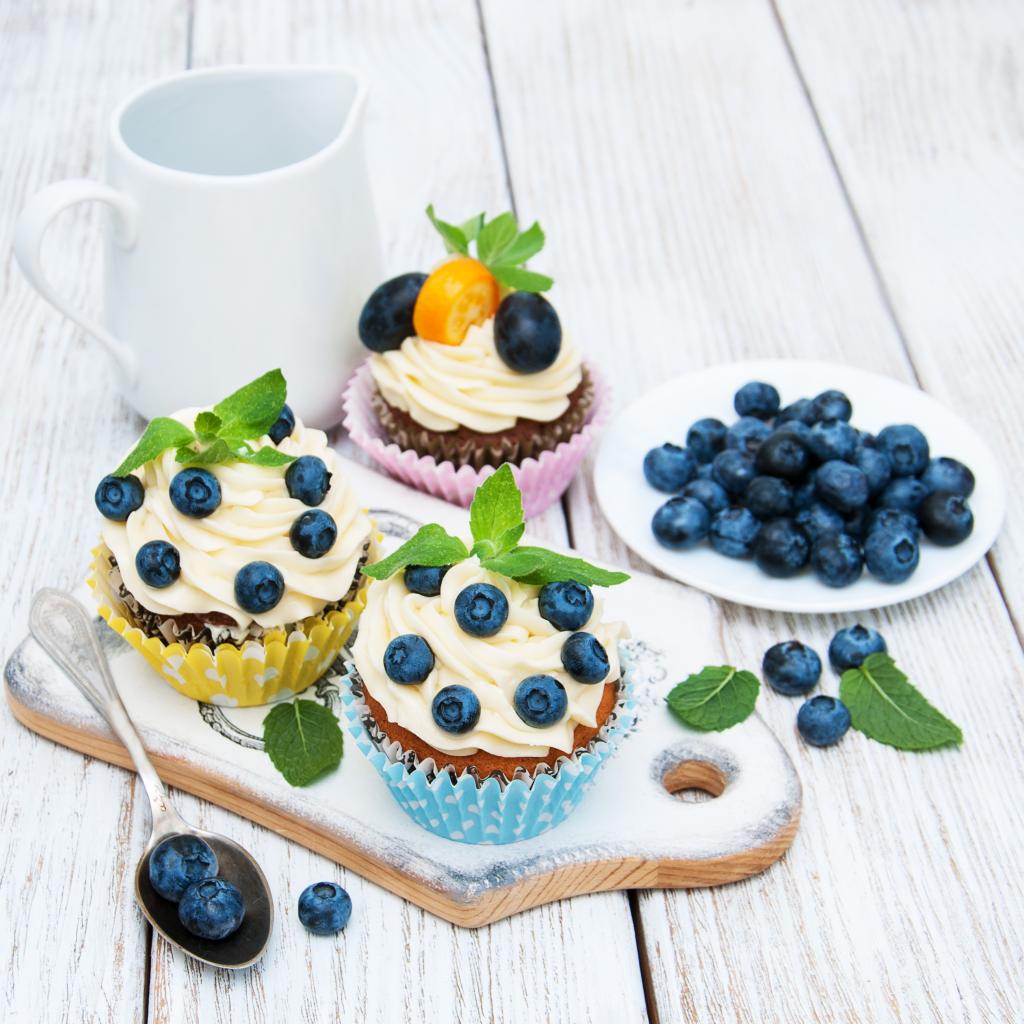 Wallpaper Pie with cream and tasty muffins with blueberries on a table with lilac flowers