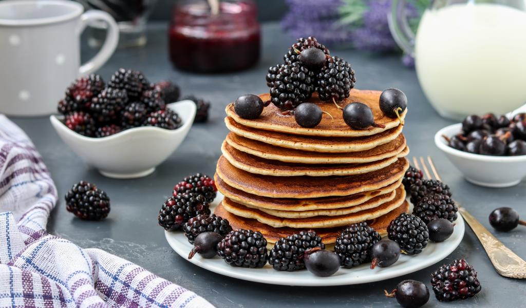 Wallpaper Ruddy pancakes on a plate with blueberries and currants