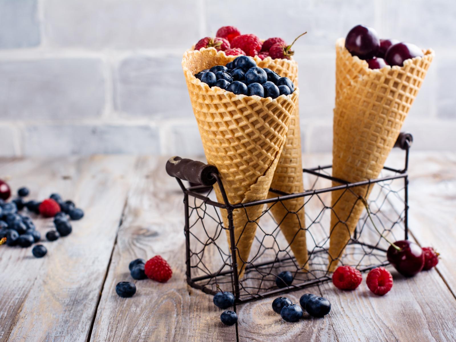 Wallpaper Two waffle cones on a table with berries
