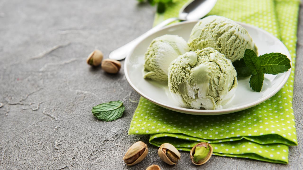 Wallpaper Pistachio ice cream balls on a plate with mint