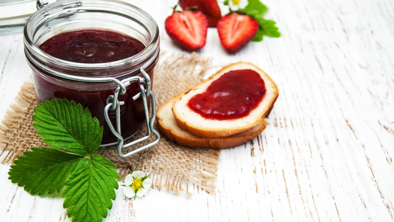 Wallpaper Jar of strawberry jam on a table with a loaf