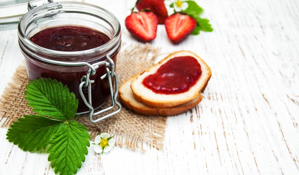 Wallpaper Jar of strawberry jam on a table with a loaf