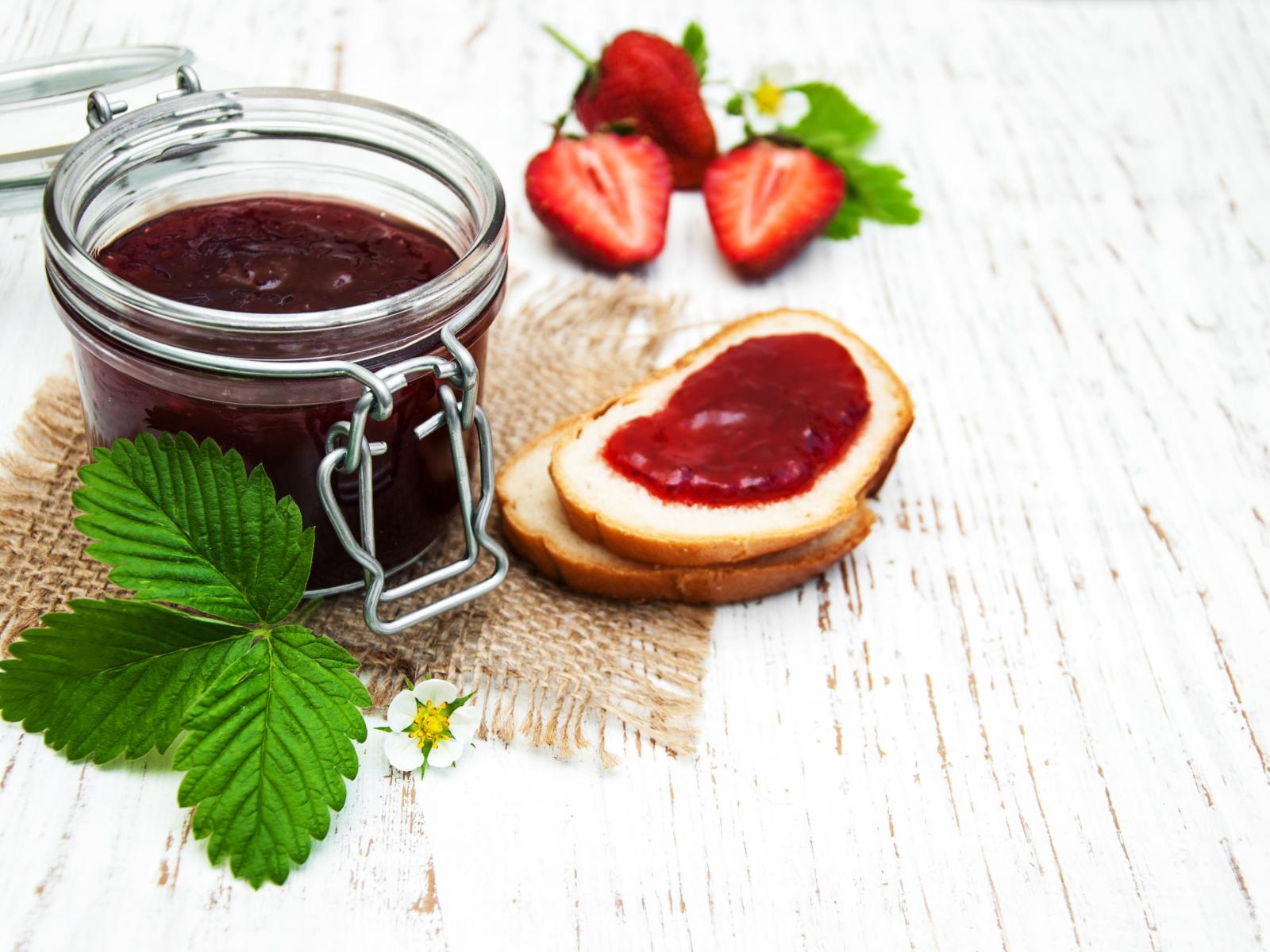 Wallpaper Jar of strawberry jam on a table with a loaf