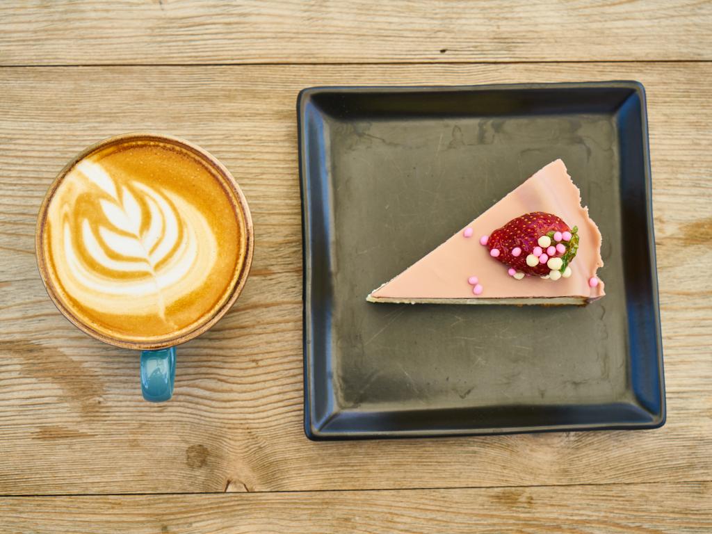 Wallpaper A piece of cake on a black plate with coffee