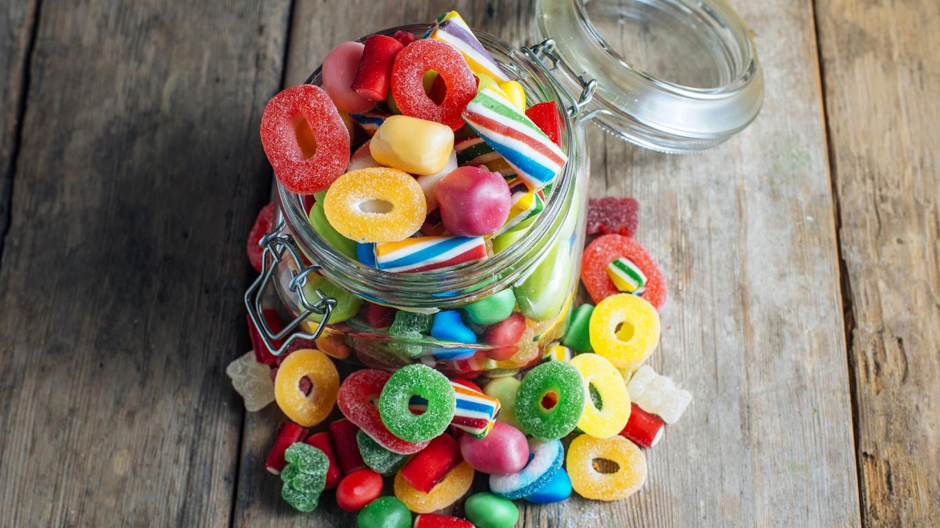Wallpaper Glass jar with multi-colored jelly candies