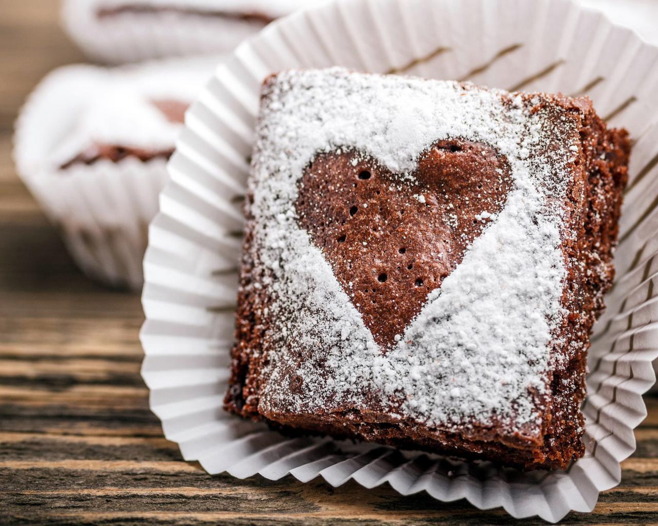 Wallpaper A piece of brownie dessert with powdered sugar heart