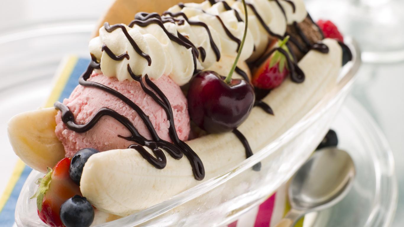 » Wallpaper Ice cream balls on a plate with bananas and cherries