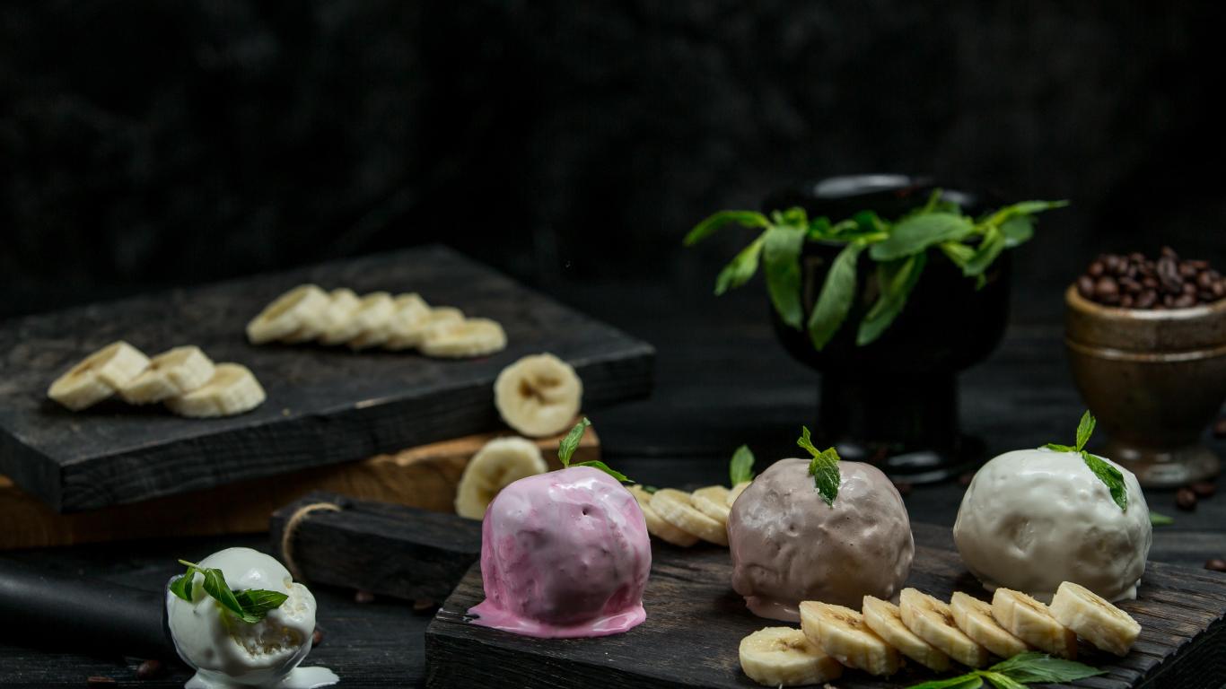 Wallpaper Ice cream balls on a table with banana slices