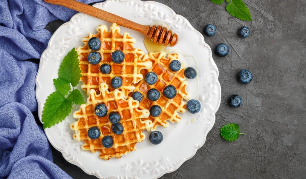 Wallpaper Sweet waffles with honey on a plate with blueberries
