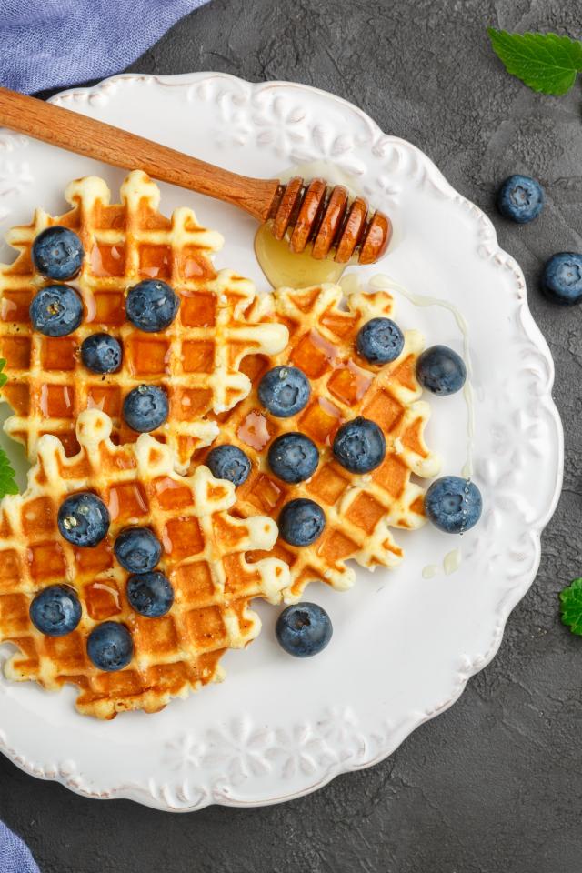 Wallpaper Sweet waffles with honey on a plate with blueberries