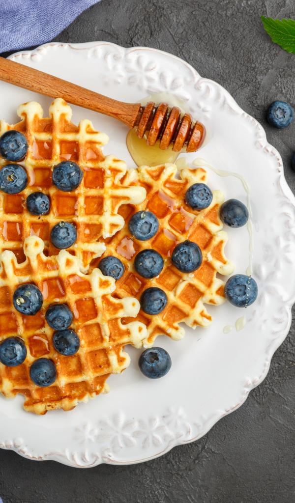 Wallpaper Sweet waffles with honey on a plate with blueberries