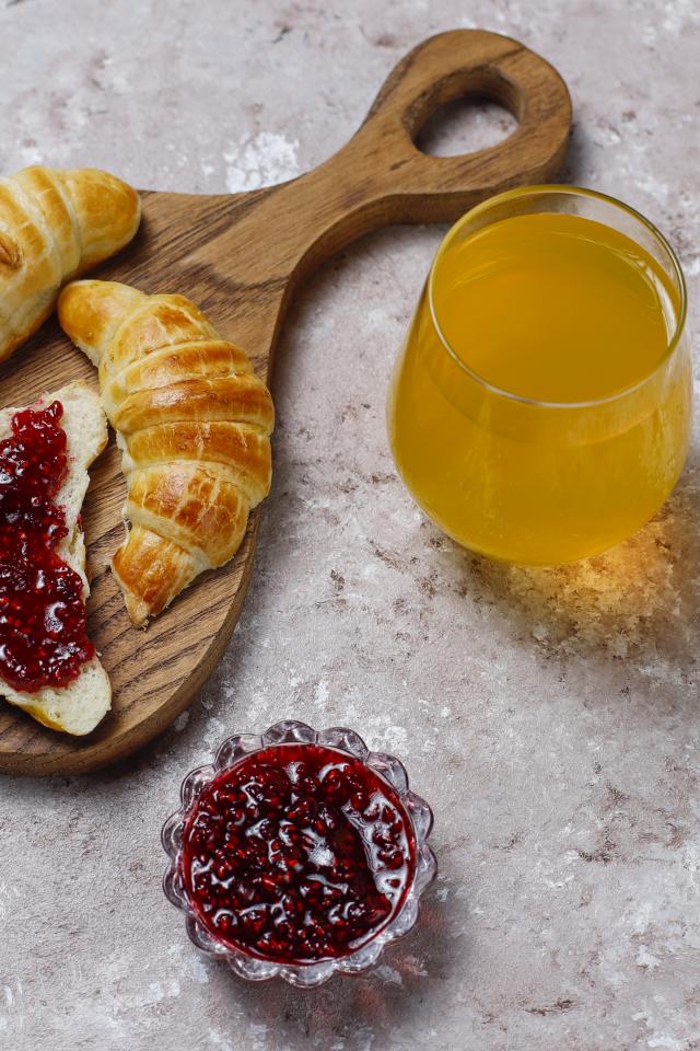 Wallpaper Juice on the table with croissants and jam