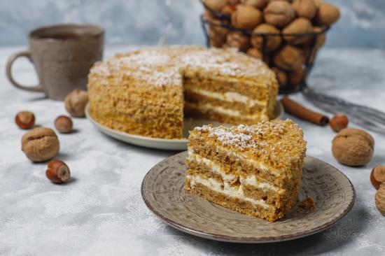 Wallpaper Honey cake on a table with nuts and a cup of coffee